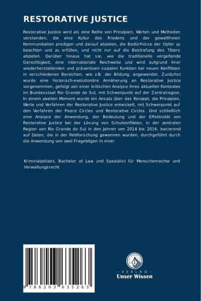 Restorative Justice wird als eine Reihe von Prinzipien, Werten und Methoden verstanden, die eine Kultur des Friedens und der gewaltfreien Kommunikation predigen und darauf abzielen, die Bedürfnisse der Opfer zu beachten und zu erfüllen, und nicht nur auf die Bestrafung des Täters abzielen. Darüber hinaus hat sie, wie die traditionelle vergeltende Gerechtigkeit, eine internationale Reichweite und wird aufgrund ihrer wiederherstellenden und präventiven sozialen Funktion bei neuen Konflikten in verschiedenen Bereichen, wie z.B. der Bildung, angewendet. Zunächst wurde eine historisch-evolutionäre Annäherung an Restorative Justice vorgenommen, gefolgt von einer kritischen Analyse ihres aktuellen Kontextes im Bundesstaat Rio Grande do Sul, mit Schwerpunkt auf der Zentralregion. In einem zweiten Moment wurde ein Ansatz über das Konzept, die Prinzipien, Werte und Verfahren der Restorative Justice entwickelt, mit Schwerpunkt auf den Verfahren der Peace Circles und Restorative Circles. Undschließlich eine Analyse der Anwendung, der Bedeutung und der Effektivität von Restorative Justice bei der Lösung von Schulkonflikten, in der zentralen Region von Rio Grande do Sul in den Jahren von 2014 bis 2016, basierend auf Daten, die in der Feldforschung gewonnen wurden, durchgeführt durch die Anwendung von zwei Fragebögen in einer
