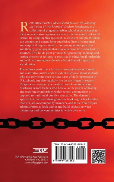 A volume in Educational Leadership for Social Justice Restorative Practice Meets Social Justice: Un-silencing the Voices of "At-Promise" Student Populations is a collection of pragmatic urban school experiences that focus on restorative approaches situated in the context of social justice. By adopting this approach, researchers and practitioners can connect and extend long-established lines of conceptual and empirical inquiry aimed at improving school practices and thereby gain insights that may otherwise be overlooked or assumed. This holds great promise for generating, refining, and testing theories of restorative practices in educational leadership and will help strengthen already vibrant lines of inquiry on social justice. The authors posit that a broader conceptualization of social and restorative justice adds to extant discourse about students who not only experience various types of daily oppression in US schools but also regularly live on the fringes of society. Chapters are written by a combination of researchers and practicing school leaders who believe in the power of healing and restoring relationships within school communities as opposed to traditional punitive structures. The dynamic approaches discussed throughout the book urge school leaders, teachers, school community members, and those who prepare administrators to look within and build bridges between themselves and the communities in which they serve.