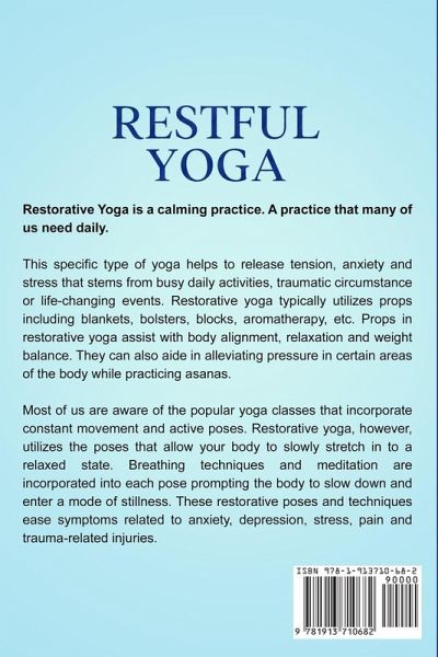 Restorative Yoga is a calming practice. A practice that many of us need daily. This specific type of yoga helps to release tension, anxiety and stress that stems from busy daily activities, traumatic circumstance or life-changing events. Restorative yoga typically utilizes props including blankets, bolsters, blocks, aromatherapy, etc. Props in restorative yoga assist with body alignment, relaxation and weight balance. They can also aide in alleviating pressure in certain areas of the body while practicing asanas. Most of us are aware of the popular yoga classes that incorporate constant movement and active poses. Restorative yoga, however, utilizes the poses that allow your body to slowly stretch in to a relaxed state. Breathing techniques and meditation are incorporated into each pose prompting the body to slow down and enter a mode of stillness. These restorative poses and techniques ease symptoms related to anxiety, depression, stress, pain and trauma-related injuries. In This Book You Will Learn: ¿ A Restorative Practice at Home ¿ Breathing Techniques ¿ Types of Poses: Meditation, Reclining Tree Pose, Reclined Angle Pose ¿ Meditation Methods ¿ 50 Beginner Yoga Poses For You ¿ More Types of Yoga: Vinyasa, Yin, Restorative ¿ Alignment and Balance - Props ¿ Unlocking Your True Purpose Through Mindfulness ¿ Re-centering Yourself ¿ Giving Your Emotions Space ¿ How to Foster True Joy Restorative Poses You Will Find Include: ¿ Sukhasana ¿ Paschimottanasana ¿ Vrksasana ¿ Dandasana ¿ Supta Matsyendrasana ¿ Marjaryasana ¿ Savasana ¿ Baddha Konasana ¿ Adho Mukha Svanasana ¿ Vajrasana ¿ Balasana ¿ Urdhva Mukha Svanasana And So Much More! Pick up your copy of the book right now by clicking the BUY NOW button at the top of this page!