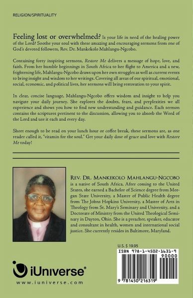 Feeling lost or overwhelmed? Is your life in need of the healing power of the Lord? Soothe your soul with these amazing and encouraging sermons from one of God's devoted followers, Rev. Dr. Mankekolo Mahlangu-Ngcobo. Containing forty inspiring sermons, Restore Me delivers a message of hope, love, and faith. From her humble beginnings in South Africa to her flight to America and a new, frightening life, Mahlangu-Ngcobo draws upon her own struggles as well as current events to bring insight and wisdom to her writings. Covering all areas of our spiritual, emotional, social, economic, and political lives, her sermons will bring restoration to your spirit. In clear, concise language, Mahlangu-Ngcobo offers wisdom and insight to help you navigate your daily journey. She explores the doubts, fears, and perplexities we all experience and shows you how to find new understanding and guidance. Each sermon contains the scriptures pertinent to the discussion, allowing you to absorb the Word of the Lord and use it each and every day. Short enough to be read on your lunch hour or coffee break, these sermons are, as one reader called it, "vitamin for the soul." Get your daily dose of grace and love with Restore Me today!
