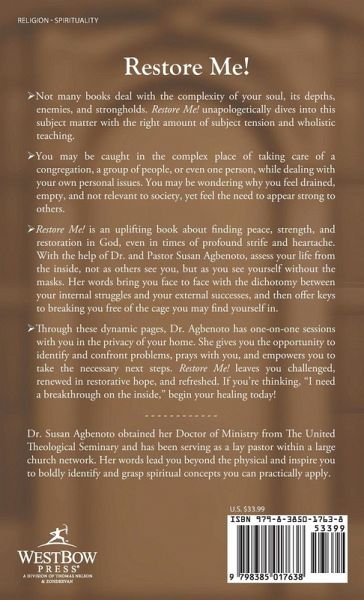 ¿ Restore Me! dives right into the matter from the first page: Who cares for the one who gives care? You may be caught in the complex place of taking care of a congregation, a group of people, or even one while dealing with your own personal issues. ¿ You may be wondering why you feel empty, fatigued, not relevant to society, yet feeling the need to appear strong to others. Restore me! gives you the opportunity to honestly assess your life from the inside, not as others see you, but as you see yourself without the masks. It brings you face to face with the reality of the dichotomy between your internal struggles and your external successes, and then offers keys to breaking you free of the cage you may find yourself in. ¿ Through these dynamic pages Dr. Agbenoto has one-on-one sessions with you in the privacy of your home. She gives you the opportunity to identify and confront problems, prays with you, and empowers you to take the necessary next steps. Restore me! leaves you challenged, renewed in restorative hope and refreshed. Pick up your copy and begin your journey of restoration!