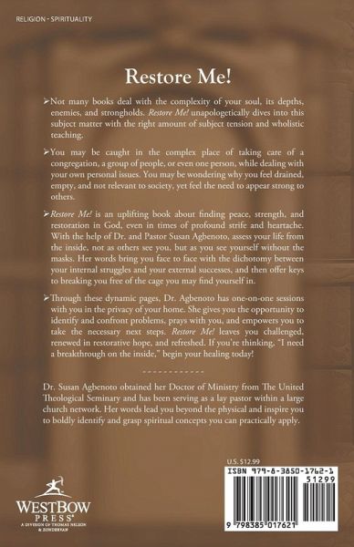 ¿ Restore Me! dives right into the matter from the first page: Who cares for the one who gives care? You may be caught in the complex place of taking care of a congregation, a group of people, or even one while dealing with your own personal issues. ¿ You may be wondering why you feel empty, fatigued, not relevant to society, yet feeling the need to appear strong to others. Restore me! gives you the opportunity to honestly assess your life from the inside, not as others see you, but as you see yourself without the masks. It brings you face to face with the reality of the dichotomy between your internal struggles and your external successes, and then offers keys to breaking you free of the cage you may find yourself in. ¿ Through these dynamic pages Dr. Agbenoto has one-on-one sessions with you in the privacy of your home. She gives you the opportunity to identify and confront problems, prays with you, and empowers you to take the necessary next steps. Restore me! leaves you challenged, renewed in restorative hope and refreshed. Pick up your copy and begin your journey of restoration!