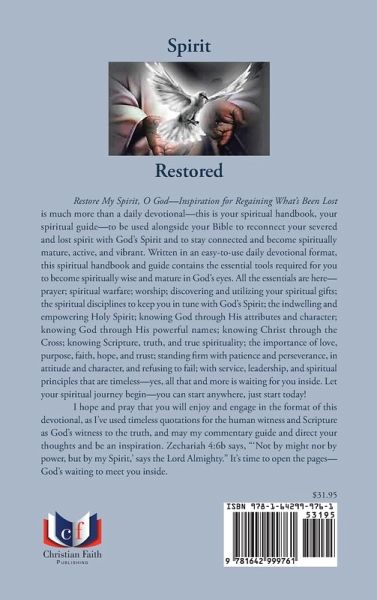 Restore My Spirit, O God—Inspiration for Regaining What’s Been Lost is much more than a daily devotional—this is your spiritual handbook, your spiritual guide—to be used alongside your Bible to reconnect your severed and lost spirit with God’s Spirit and to stay connected and become spiritually mature, active, and vibrant. Written in an easy-to-use daily devotional format, this spiritual handbook and guide contains the essential tools required for you to become spiritually wise and mature in God’s eyes. All the essentials are here—prayer; spiritual warfare; worship; discovering and utilizing your spiritual gifts; the spiritual disciplines to keep you in tune with God’s Spirit; the indwelling and empowering Holy Spirit; knowing God through His attributes and character; knowing God through His powerful names; knowing Christ through the Cross; knowing Scripture, truth, and true spirituality; the importance of love, purpose, faith, hope, and trust; standing firm with patience and perseverance, in attitude and character, and refusing to fail; with service, leadership, and spiritual principles that are timeless—yes, all that and more is waiting for you inside. Let your spiritual journey begin—you can start anywhere, just start today! I hope and pray that you will enjoy and engage in the format of this devotional, as I’ve used timeless quotations for the human witness and Scripture as God’s witness to the truth, and may my commentary guide and direct your thoughts and be an inspiration. Zechariah 4:6b says, "‘Not by might nor by power, but by my Spirit,’ says the Lord Almighty." It’s time to open the pages—God’s waiting to meet you inside.