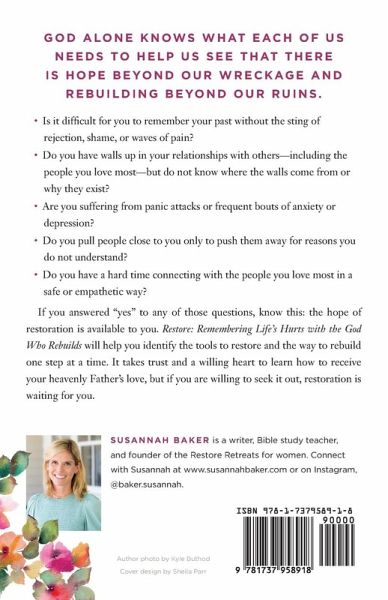 GOD ALONE KNOWS WHAT EACH OF US NEEDS TO HELP US SEE THAT THERE IS HOPE BEYOND OUR WRECKAGE AND REBUILDING BEYOND OUR RUINS.Is it difficult for you to remember your past without the sting of rejection, shame, or waves of pain? Do you have walls up in your relationships with others - including the people you love most - but do not know where the walls come from or why they exist? Are you suffering from panic attacks or frequent bouts of anxiety or depression? Do you pull people close to you only to push them away for reasons you do not understand? Do you have a hard time connecting with the people you love most in a safe or empathetic way? If you answered "yes" to any of those questions, know this: the same tools of restoration that were available to me are available to you. Restore: Remembering Life's Hurts with the God Who Rebuilds will help you identify those tools and the way to rebuild one step at a time. It doesn't take a counseling degree or a course in graduate school to learn how to use them; it simply takes desire, time, focus, and endurance. It takes trust and a willing heart to learn how to properly receive your heavenly Father's love. Restoration is waiting.