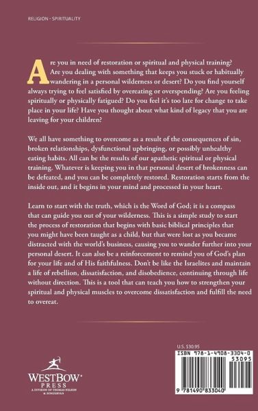 Are you in need of restoration or spiritual and physical training? Are you dealing with something that keeps you stuck or habitually wandering in a personal wilderness or desert? Do you find yourself always trying to feel satisfied by overeating or overspending? Are you feeling spiritually or physically fatigued? Do you feel it's too late for change to take place in your life? Have you thought about what kind of legacy that you are leaving for your children? We all have something to overcome as a result of the consequences of sin, broken relationships, dysfunctional upbringing, or possibly unhealthy eating habits. All can be the results of our apathetic spiritual or physical training. Whatever is keeping you in that personal desert of brokenness can be defeated, and you can be completely restored. Restoration starts from the inside out, and it begins in your mind and processed in your heart. Learn to start with the truth, which is the Word of God; it is a compass that can guide you out of your wilderness. This is a simple study to start the process of restoration that begins with basic biblical principles that you might have been taught as a child, but that were lost as you became distracted with the world's business, causing you to wander further into your personal desert. It can also be a reinforcement to remind you of God's plan for your life and of His faithfulness. Don't be like the Israelites and maintain a life of rebellion, dissatisfaction, and disobedience, continuing through life without direction. This is a tool that can teach you how to strengthen your spiritual and physical muscles to overcome dissatisfaction and fulfill the need to overeat.