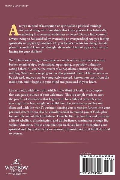 Are you in need of restoration or spiritual and physical training? Are you dealing with something that keeps you stuck or habitually wandering in a personal wilderness or desert? Do you find yourself always trying to feel satisfied by overeating or overspending? Are you feeling spiritually or physically fatigued? Do you feel it's too late for change to take place in your life? Have you thought about what kind of legacy that you are leaving for your children? We all have something to overcome as a result of the consequences of sin, broken relationships, dysfunctional upbringing, or possibly unhealthy eating habits. All can be the results of our apathetic spiritual or physical training. Whatever is keeping you in that personal desert of brokenness can be defeated, and you can be completely restored. Restoration starts from the inside out, and it begins in your mind and processed in your heart. Learn to start with the truth, which is the Word of God; it is a compass that can guide you out of your wilderness. This is a simple study to start the process of restoration that begins with basic biblical principles that you might have been taught as a child, but that were lost as you became distracted with the world's business, causing you to wander further into your personal desert. It can also be a reinforcement to remind you of God's plan for your life and of His faithfulness. Don't be like the Israelites and maintain a life of rebellion, dissatisfaction, and disobedience, continuing through life without direction. This is a tool that can teach you how to strengthen your spiritual and physical muscles to overcome dissatisfaction and fulfill the need to overeat.