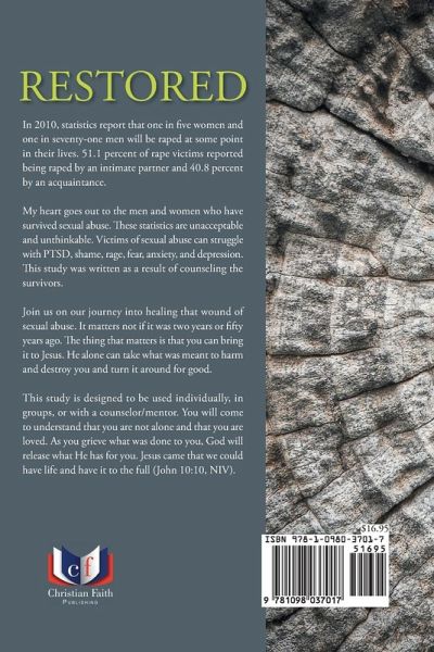 In 2010, statistics report that one in five women and one in seventy-one men will be raped at some point in their lives. 51.1 percent of rape victims reported being raped by an intimate partner and 40.8 percent by an acquaintance. My heart goes out to the men and women who have survived sexual abuse. These statistics are unacceptable and unthinkable. Victims of sexual abuse can struggle with PTSD, shame, rage, fear, anxiety, and depression. This study was written as a result of counseling the survivors. Join us on our journey into healing that wound of sexual abuse. It matters not if it was two years or fifty years ago. The thing that matters is that you can bring it to Jesus. He alone can take what was meant to harm and destroy you and turn it around for good. This study is designed to be used individually, in groups, or with a counselor/mentor. You will come to understand that you are not alone and that you are loved. As you grieve what was done to you, God will release what He has for you. Jesus came that we could have life and have it to the full (John 10:10, NIV).