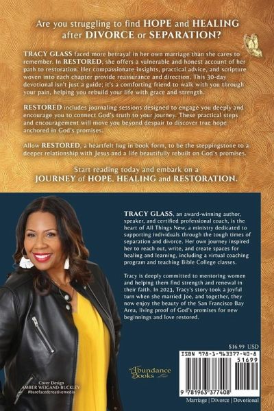 Are you struggling to find HOPE and HEALING after DIVORCE or SEPARATION? Tracy Glass faced more betrayal in her marriage than she cares to remember. In RESTORED, she offers a vulnerable and honest account of her path to restoration. Her compassionate insights, practical advice, and scripture woven into each chapter provide reassurance and direction. This 30-day devotional isn't just a guide; it's a comforting friend to walk with you through your pain, helping you rebuild your life with grace and strength. RESTORED includes journaling sessions designed to engage you deeply and encourage you to connect God's truth to your journey. These practical steps and encouragement will move you beyond despair to discover true hope anchored in God's promises. Allow RESTORED, a heartfelt hug in book form, to be the stepping stone to a deeper relationship with Jesus and life beautifully rebuilt on God's promises. Start reading today and embark on a JOURNEY of HOPE, HEALING, and RESTORATION.