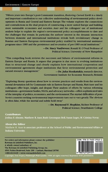 Among the most costly and complicated chapters in the former Eastern bloc countries' transitions to democracy is the clean up and restoration of the environment. Even as Communist-era environmental problems fade in significance-such as pollution from heavy industry-new threats have emerged. Restoring Cursed Earth considers how rule making, sanctions, incentives, and programs shape environmental protection efforts, and whether and to what extent these emerging policy structures are promoting environmental well-being for citizens in Russia, the Czech Republic, Hungary, Romania, and Estonia.