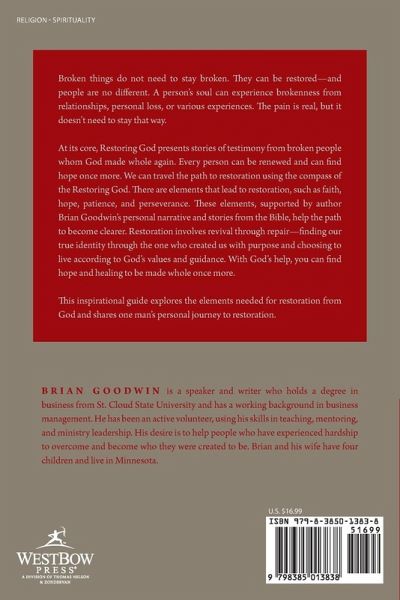 Broken things do not need to stay broken. They can be restored-and people are no different. A person's soul can experience brokenness from relationships, personal loss, or various experiences. The pain is real, but it doesn't need to stay that way. At its core, Restoring God presents stories of testimony from broken people whom God made whole again. Every person can be renewed and can find hope once more. We can travel the path to restoration using the compass of the Restoring God. There are elements that lead to restoration, such as faith, hope, patience, and perseverance. These elements, supported by author Brian Goodwin's personal narrative and stories from the Bible, help the path to become clearer. Restoration involves revival through repair-finding our true identity through the one who created us with purpose and choosing to live according to God's values and guidance. With God's help, you can find hope and healing to be made whole once more. This inspirational guide explores the elements needed for restoration from God and shares one man's personal journey to restoration.