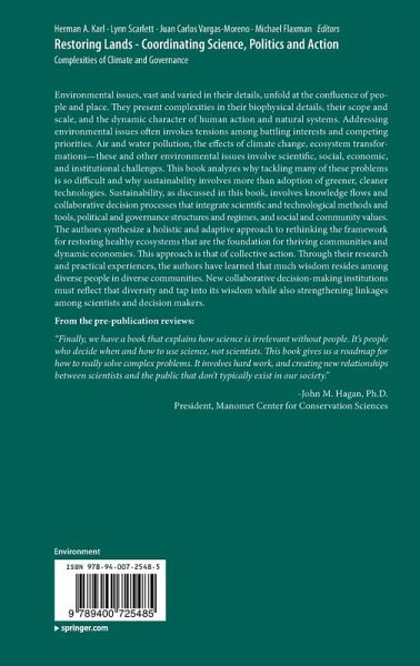 Acknowledgements.- Preface.- Introduction: Chapter 1 Restoring and Sustaining Lands-Coordinating Science, Politics, and Communities for Action, by Karl, Scarlett, Vargas-Moreno, and Flaxman.- Section One-Science, Technology, and Engineering (Tools and Methods): Chapter 2 Section Introduction, by Flaxman and Vargas-Moreno.- Chapter 3: Participatory Climate Change Scenario and Simulation Modeling: Exploring Future Conservation Challenges in the Greater Everglades Landscape, by Vargas-Moreno and Flaxman.- Chapter 4 Using "Spatial Resilience Planning" to Test Climate-Adaptive Conservation Strategies, by Flaxman and Vargas-Moreno.- Chapter 5: Cities and Integrated Water Planning: Complexities of Climate Change, by Kirshen and others.- Chapter 6 Collaborative Modeling: Institutional Complexities, by Barreteau and others; Chapter 7 Challenge of Integrating Natural and Social Sciences to Better Inform Decisions: A Novel Proposal Review Process, by Matso.- Section Two-Politics and Policy (Governance and Frameworks): Chapter 8 Section Introduction, by Scarlett; Chapter 9 Transcending Boundaries: The Emergence of Conservation Networks, by Scarlett.- Chapter 10 Managing the Science-Policy Interface in a Complex and Contentious World, by Beratan and Karl.- Chapter 11 Deliberative Democratic Governance to Foster Sustainability, by Merad.- Chapter 12 Values in Natural Resource Management and Policy, by Mattson and others.- Chapter 13 Flow in the Everglades: The Game Inside the Game, by Light.- Chapter 14 Framing an Uncertain Climate: Adaptation and Water Management Practice in the Netherlands, by Hogendorn, Laws, and Petersen.- Chapter 15 Adapting to Changing Climate: Exploring the Role of the Neighborhood, by Karl and others.- Section Three-People and Action (Implementation and Stewardship): Chapter 16 Section Introduction, by Karl.- Chapter 17 Community-based Ecological Stewardship-AConcept for Productive Harmony on the Public Lands of the Western United States, by McVicker.- Chapter 18 Thoughts on How to Implement Citizen Based Ecosystem Stewardship from 32 Years in Governance, by Whitley.- Chapter 19 Climate Change and the Language of Geographic Place, by Kent and Preister.- Chapter 20 Tomales Bay Watershed Council: Model of Collective Action, by Pileggi and others.- Chapter 21 Outcomes of social-ecological experiments in near-shore marine environments: cognitive interpretation of the impact of changes in fishing gear type on ecosystem form and function, by Curtin and Hammitt.- Synthesis: Chapter 22 Synthesis: Developing the institutions to coordinate science, politics, and communities for action to restore and sustain lands, by Karl, Scarlett, Vargas-Moreno, Flaxman.