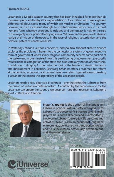 Lebanon is a Middle Eastern country that has been inhabited for more than six thousand years, and today it has a population of four million with over eighteen different religious sects, many of which are Muslim or Christian. The country, however, is in an incessant struggle to institutionalize democracy in its most humane form, whereby everyone is included and democracy is neither the rule of the majority nor a political lobbying arena. Yet how can the people of Lebanon realize their vision of democracy in the face of religious sectarianism and the political system of confessionalism? In Restoring Lebanon, author, economist, and political theorist Nizar Y. Younes explores the problems inherent to the confessional system of governmenta form of government where every religious community secures some portion of the stateand argues instead how this partitioning of government practically results in the disintegration of the state and eradicates any notion of citizenship. In addition to digging further into the root of the barriers to institutionalism and development in Lebanon, Restoring Lebanon offers a roadmap for reform at the political, economic, and cultural levelsa reform geared toward creating a Lebanon that meets the aspirations of the Lebanese people. Lebanon needs a fair, clear social contractone that frees the Lebanese from the prison of sectarian confessionalism. A contract by the Lebanese and for the Lebanese can create the country we deserveone that represents Lebanons spirit, culture, and freedom.