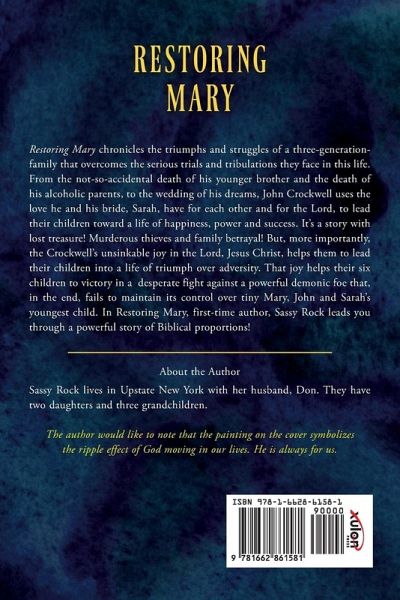 Restoring Mary chronicles the triumphs and struggles of a three-generation-family that overcomes the serious trials and tribulations they face in this life. From the not-so-accidental death of his younger brother and the death of his alcoholic parents, to the wedding of his dreams, John Crockwell uses the love he and his bride, Sarah, have for each other and for the Lord, to lead their children toward a life of happiness, power and success. It's a story with lost treasure! Murderous thieves and family betrayal! But, more importantly, the Crockwell's unsinkable joy in the Lord, Jesus Christ, helps them to lead their children into a life of triumph over adversity. That joy helps their six children to victory in a desperate fight against a powerful demonic foe that, in the end, fails to maintain its control over tiny Mary, John and Sarah's youngest child. In Restoring Mary, first-time author, Sassy Rock leads you through a powerful story of Biblical proportions! About the Author Sassy Rock lives in Upstate New York with her husband, Don. They have two daughters and three granddaughters. The author would like to note that the painting on the cover symbolizes the ripple effect of God moving in our lives. He is always for us.