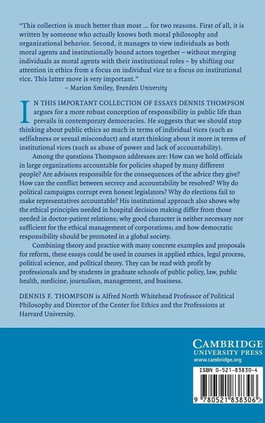 In this important collection of essays Dennis Thompson argues for a more robust conception of responsibility in public life than prevails in contemporary democracies. He suggests that we should stop thinking so much about public ethics in terms of individual vices (such as selfishness or sexual misconduct) and start thinking about it more in terms of institutional vices (such as abuse of power and lack of accountability). Combining theory and practice with many concrete examples and proposals for reform, these essays could be used in courses in applied ethics or political theory and will be read by professionals and graduate students in schools of political science, public policy, law, public health, journalism and business.