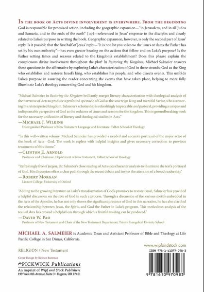 In the book of Acts divine involvement is everywhere. From the beginning God is responsible for promised action, including the geographic expansion--"in Jerusalem, and in all Judea and Samaria, and to the ends of the earth" (1:7)--referenced in Jesus' response to the disciples, clearly related to Luke's purpose in writing the book. Geographic expansion, however, is only the second part of Jesus' reply. Is it possible that the first half of Jesus' reply--"It is not for you to know the times or dates the Father has set by his own authority"--has even greater bearing on the actions that follow and on Luke's purpose? Is the Father setting times and seasons related to the kingdom's establishment? Does this phrase explain the conspicuous divine involvement throughout the plot? In Restoring the Kingdom, Michael Salmeier answers these questions in the affirmative by exploring Luke's characterization of God in three strands: God as the King who establishes and restores Israel's king, who establishes his people, and who directs events. This unfolds Luke's purpose in assuring the reader concerning the events that have taken place, helping to more fully illuminate Luke's theology concerning God and his kingdom.