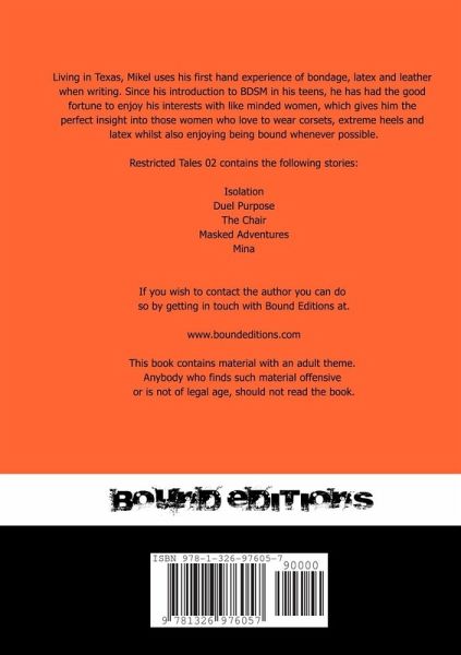 Living in Texas, Mikel uses his first hand experience of bondage, latex and leather when writing. Since his introduction to BDSM in his teens, he has had the good fortune to enjoy his interests with like minded women, which gives him the perfect insight into those women who love to wear corsets, extreme heels and latex whilst also enjoying being bound whenever possible. Restricted Tales 02 contains the following stories: Isolation Duel Purpose The Chair Masked Adventures Mina
