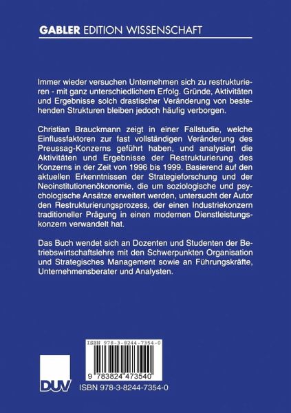 Christian Brauckmann zeigt in einer Fallstudie, welche Einflussfaktoren zur fast vollständigen Veränderung des Preussag-Konzerns geführt haben, und analysiert die Aktivitäten und Ergebnisse der Restrukturierung des Konzerns in der Zeit von 1996 bis 1999. Basierend auf den aktuellen Erkenntnissen der Strategieforschung und der Neoinstitutionenökonomie, die um soziologische und psychologische Ansätze erweitert werden, untersucht der Autor den Restrukturierungsprozess, der einen Industriekonzern traditioneller Prägung in einen modernen Dienstleistungskonzern verwandelt hat.