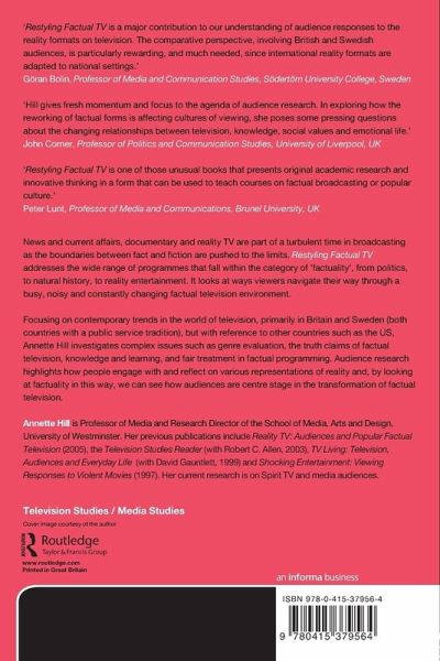 Addressing the wide range of programmes and formats from news, to documentary, to popular factual genres, Annette Hill 's new book examines the ways viewers navigate their way through a busy, noisy and constantly changing factual television environment. Restyling Factual TV addresses the wide range of programmes that fall within the category of 'factuality', from politics, to natural history, to reality entertainment. Based on research with audiences of factual TV, primarily in Sweden and the UK, but with reference to other countries such as the US, this book tackles issues such as legitimacy, ethics and value in contemporary news and current affairs, documentary and reality programming. Drawing on the ethics of truth-telling and notions of quality, this wide-ranging, authoritative book expands the debate on popular factual entertainment and will be a welcome addition to the current literature.