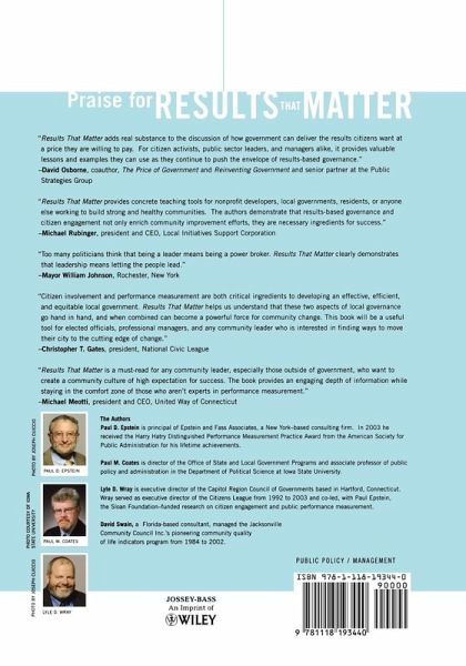 Today's communities--whether they are currently strong, or struggling to survive--face difficult challenges if they want to be tomorrow's healthy, vibrant communities. The challenge for leaders and citizens of modern communities is not just to solve specific problems today. Their real challenge is to keep learning from their experience so they can keep improving their communities tomorrow. Results That Matter will provide a new governance framework for using valuable tools of community improvement--especially performance measurement and citizen engagement--to empower communities to achieve the outcomes their citizens most desire. Government and nonprofit managers will learn how to combine these tools in new ways, not only to achieve one-time improvement of their organizations and communities, but to foster continual community renewal and improvement. The benefits and practicality of the framework and related practices will be reinforced by case examples from 25 communities across the country. The book will offer "how to" guidance to public and nonprofit managers, including promising practices for effective communities, and new roles for citizens, community leaders, and managers.