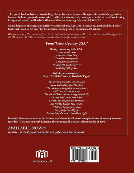 This poetic book of lyrics written in English and Jamaican Patois, will capture the reader's imagination but must be heard put to the music with its vibrant and sensual rhythms, spiced with Lorraine's enchanting background vocals, on Bluedan's Album -"Bluedan Featuring Lorraine - RESUME!! Coinciding with his reggae and R&B style debut album, RESUME, Bluedan has published this book of lyrics that touch on his everyday life experiences and pride on becoming a US citizen. Bluedan was born Gareth Oliver James in the Parish of St. James, Jamaica W.I, where he lived until he migrated to the US in mid-1995. He was inspired to write these insightful patriotic poems... From "Great Country USA " What great country is the USA . American dreams is my bed where I lay. To build a strong team is the American's way for strength and prosperity what its people pray... And of course romance!... From "My Baby Wants to Hold Me Tight" The evening sun sets over the ocean while descending from the skies. The rainbow colors paint the mountains with the rivers runnin' by. The evenin' breeze rushes along the hillside, And my babe's arms open wide. I see the beauty from her pure eyes and feel the passion that strides. While my baby's by my side, to my baby I'm obliged, And my baby she wants to hold me tight. Bluedan's chance encounter with Lorraine would soon find him realizing his dream of hearing his music recorded. Collaborating with Lorraine, they produced their debut album in May of 2008. AVAILABLE NOW !!! In Stores, at cdbaby.com/cd/bluedan & myspace.com/bluedanmusic