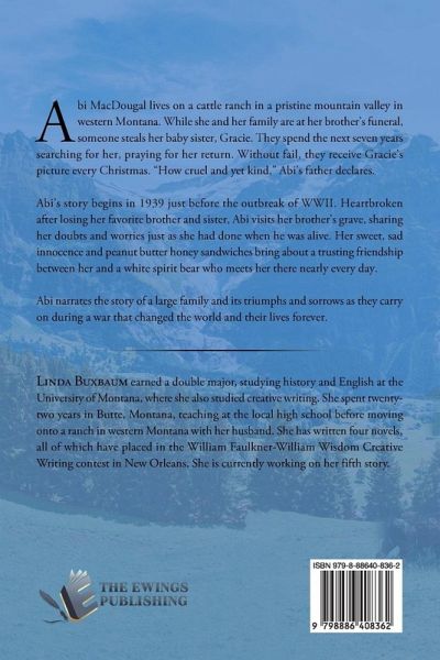 Abi MacDougal lives on a cattle ranch in a pristine mountain valley in western Montana. While she and her family are at her brother's funeral, someone steals her baby sister, Gracie. They spend the next seven years searching for her, praying for her return. Without fail, they receive Gracie's picture every Christmas. "How cruel and yet kind," Abi's father declares. Abi's story begins in 1939 just before the outbreak of WWII. Heartbroken after losing her favorite brother and sister, Abi visits her brother's grave, sharing her doubts and worries just as she had done when he was alive. Her sweet, sad innocence and peanut butter honey sandwiches bring about a trusting friendship between her and a white spirit bear who meets her there nearly every day. Abi narrates the story of a large family and its triumphs and sorrows as they carry on during a war that changed the world and their lives forever.
