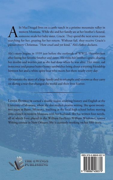 Abi MacDougal lives on a cattle ranch in a pristine mountain valley in western Montana. While she and her family are at her brother's funeral, someone steals her baby sister, Gracie. They spend the next seven years searching for her, praying for her return. Without fail, they receive Gracie's picture every Christmas. "How cruel and yet kind," Abi's father declares. Abi's story begins in 1939 just before the outbreak of WWII. Heartbroken after losing her favorite brother and sister, Abi visits her brother's grave, sharing her doubts and worries just as she had done when he was alive. Her sweet, sad innocence and peanut butter honey sandwiches bring about a trusting friendship between her and a white spirit bear who meets her there nearly every day. Abi narrates the story of a large family and its triumphs and sorrows as they carry on during a war that changed the world and their lives forever.