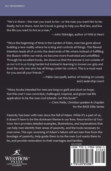 "He's in there--the man you want to be--or the man you want him to be. Really, he's in there. And Jim's book is going to help you find him, and live the life you want to live as a man." --John Eldredge, author of Wild at Heart "Since the beginning of time in the Garden of Eden, man has gone about building a new reality where he is king and controls all things. This flawed intention leads all of us into the dead ends of life where instead of fulfilling the illusion within our mind, we become more frustrated and unfulfilled. Through his excellent book, Jim shows us that the answer is not outside of us nor is it in us trying harder but instead in learning to loosen our grip and trust the only one who has all things under his control. This is a must read for you and all your friends." --Pablo Giacopelli, author of Holding on Loosely and Leadership Coach "Many books intended for men are long on guilt and short on hope. Not this one! I was convicted, challenged, inspired, and given real life application to be the man God intends. Get this book!" --Chris Wells, Christian speaker & chaplain for the BASS Elite Series Passivity has been with men since the fall of Adam. While it's a part of us, it doesn't have to be the dominant theme in our lives. Resurrection of Your Inner Hero provides detailed examples, illustrations, and explanations that can help men identify their areas of passivity, and the tools necessary to overcome. This epic reversing of Adam's failure will set men free from the bondage of passivity, help guide them to be the men God wants them to be, and provide restoration to their marriages and families.