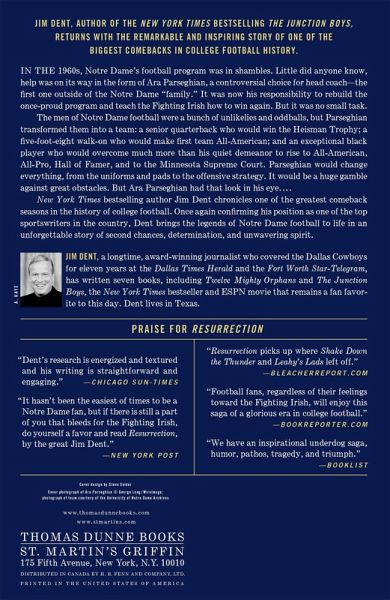 Jim Dent, author of the New York Times bestselling The Junction Boys returns with Resurrection, about the remarkable and inspiring story of one of the biggest comebacks in college football history. In the 1960's, Notre Dame's football program was in shambles. Little did anyone know, help was on its way in the form of Ara Parseghian, a controversial choice for head coach-the first one outside of the Notre Dame "family." It was now his responsibility to rebuild the once-proud program and teach the Fighting Irish how to win again. But it was no small task. The men of Notre Dame football were a bunch of unlikelies and oddballs, but Parseghian transformed them into a team: a senior quarterback who would win the Heisman Trophy; a five-foot-eight walk-on who would make first team All-American; an exceptionally rare black player, who would overcome much more than his quiet demeanor to rise to All-American, All-Pro, Hall of Famer, and to the Minnesota Supreme Court. Parseghian would change everything, from the uniforms and pads to the offensive strategy. It would be a huge gamble against great obstacles. But Ara Parseghian had that look in his eye.... New York Times bestselling author Jim Dent chronicles one of the greatest comeback seasons in the history of college football. Once again confirming his position as one of the top sports writers in the country, Dent brings the legends of Notre Dame football to life in an unforgettable story of second chances, determination, and unwavering spirit.