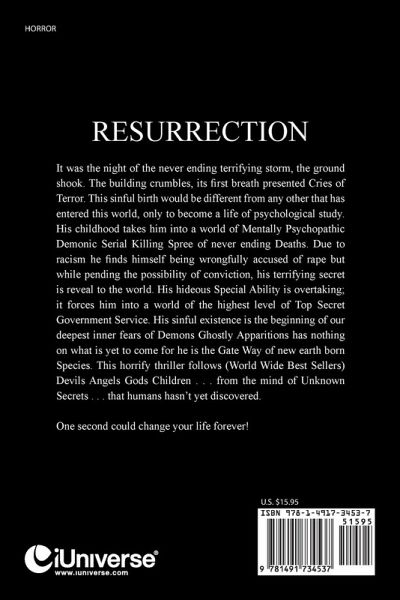It was the night of the never ending terrifying storm, the ground shook. The building crumbles, its first breath presented Cries of Terror. This sinful birth would be different from any other that has entered this world, only to become a life of psychological study. His childhood takes him into a world of Mentally Psychopathic Demonic Serial Killing Spree of never ending Deaths. Due to racism he finds himself being wrongfully accused of rape but while pending the possibility of conviction, his terrifying secret is reveal to the world. His hideous Special Ability is overtaking; it forces him into a world of the highest level of Top Secret Government Service. His sinful existence is the beginning of our deepest inner fears of Demons Ghostly Apparitions has nothing on what is yet to come for he is the Gate Way of new earth born Species. This horrify thriller follows (World Wide Best Sellers) Devils Angels Gods Children . . . from the mind of Unknown Secrets . . . that humans hasn’t yet discovered. One second could change your life forever!