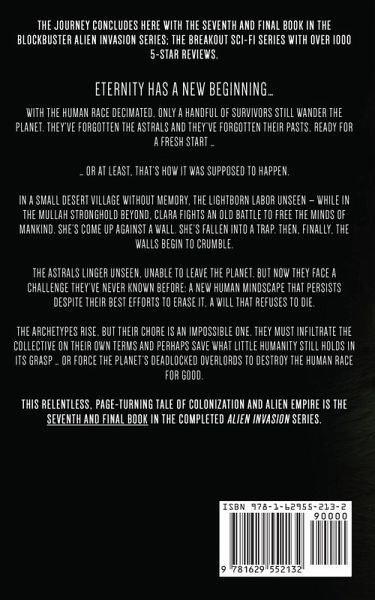 The journey concludes here with the seventh and final book in the blockbuster Alien Invasion series; the breakout sci-fi series with over 1000 5-star reviews. ETERNITY HAS A NEW BEGINNING... With the human race decimated, only a handful of survivors still wander the planet. They've forgotten the Astrals and they've forgotten their pasts, ready for a fresh start ... ... or at least, that's how it was supposed to happen. In a small desert village without memory, the Lightborn labor unseen - while in the Mullah stronghold beyond, Clara fights an old battle to free the minds of mankind. She's come up against a wall. She's fallen into a trap. Then, finally, the walls begin to crumble. The Astrals linger unseen, unable to leave the planet. But now they face a challenge they've never known before: a new human mindscape that persists despite their best efforts to erase it, a will that refuses to die. The Archetypes rise, but their chore is an impossible one. They must infiltrate the collective on their own terms and perhaps save what little humanity still holds in its grasp ... or force the planet's deadlocked overlords to destroy the human race for good. This relentless, page-turning tale of colonization and alien empire is the SEVENTH AND FINAL book in the completed Alien Invasion series.