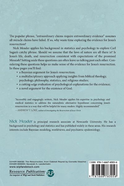 The popular phrase, ""extraordinary claims require extraordinary evidence"" assumes all miracle claims have failed. If so, why waste time exploring the evidence for Jesus's resurrection? Nick Meader applies his background in statistics and psychology to explore Carl Sagan's catchy phrase. Should we assume that the laws of nature are all there is? Is Jesus's life, death, and resurrection consistent with expectations of the promised Messiah? Setting aside these questions can often leave us talking past each other. Considering these questions helps us make sense of the evidence for Jesus's resurrection. In these pages you'll find: -a Bayesian argument for Jesus's resurrection; -a multidisciplinary approach applying insights from biblical theology, psychology, philosophy, statistics, and religious studies; -a cutting-edge evaluation of psychological explanations for the evidence; -a novel argument for the existence of God.