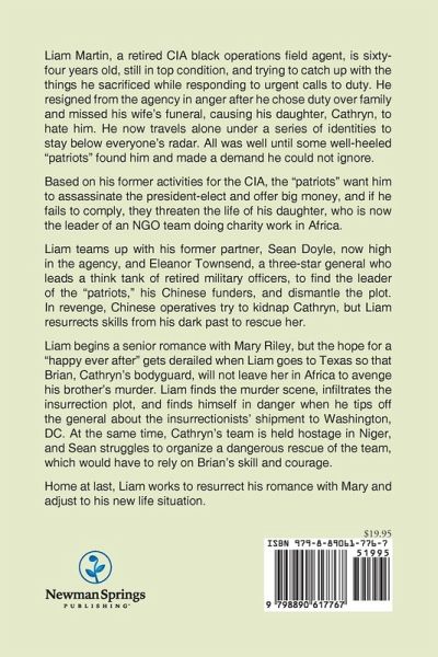 Liam Martin, a retired CIA black operations field agent, is sixty-four years old, still in top condition, and trying to catch up with the things he sacrificed while responding to urgent calls to duty. He resigned from the agency in anger after he chose duty over family and missed his wife's funeral, causing his daughter, Cathryn, to hate him. He now travels alone under a series of identities to stay below everyone's radar. All was well until some well-heeled "patriots" found him and made a demand he could not ignore. Based on his former activities for the CIA, the "patriots" want him to assassinate the president-elect and offer big money, and if he fails to comply, they threaten the life of his daughter, who is now the leader of an NGO team doing charity work in Africa. Liam teams up with his former partner, Sean Doyle, now high in the agency, and Eleanor Townsend, a three-star general who leads a think tank of retired military officers, to find the leader of the "patriots," his Chinese funders, and dismantle the plot. In revenge, Chinese operatives try to kidnap Cathryn, but Liam resurrects skills from his dark past to rescue her. Liam begins a senior romance with Mary Riley, but the hope for a "happy ever after" gets derailed when Liam goes to Texas so that Brian, Cathryn's bodyguard, will not leave her in Africa to avenge his brother's murder. Liam finds the murder scene, infiltrates the insurrection plot, and finds himself in danger when he tips off the general about the insurrectionists' shipment to Washington, DC. At the same time, Cathryn's team is held hostage in Niger, and Sean struggles to organize a dangerous rescue of the team, which would have to rely on Brian's skill and courage. Home at last, Liam works to resurrect his romance with Mary and adjust to his new life situation.