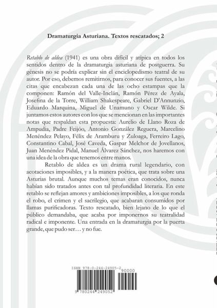 'Retablo de aldea' (1941), de José Víctor Carreño, es una obra difícil y atípica dentro de la dramaturgia asturiana de post-guerra. Su génesis no se podría explicar sin el enciclopedismo teatral de su autor. Es un drama rural legendario, con acotaciones imposibles, y a la manera poética, que trata sobre una Asturias brutal. Aunque muchos temas eran conocidos, nunca habían sido tratados antes con tal profundidad literaria. En este retablo se reflejan amores y ambiciones imposibles, a los que ronda el robo, el crimen y el sacrilegio, que acabaran consumidos por llamas purificadoras. Texto rescatado, bien lejano de lo que el público demandaba, que acaba por imponernos su teatralidad radical e imponente. Una entrada en la dramaturgia por la puerta grande, que pudo ser... y no fue.