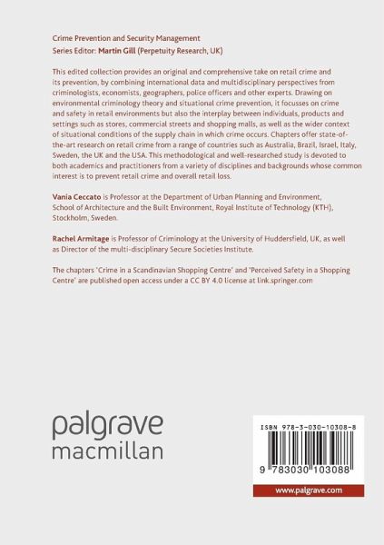 This edited collection provides an original and comprehensive take on retail crime and its prevention, by combining international data and multidisciplinary perspectives from criminologists, economists, geographers, police officers and other experts. Drawing on environmental criminology theory and situational crime prevention, it focusses on crime and safety in retail environments but also the interplay between individuals, products and settings such as stores, commercial streets and shopping malls, as well as the wider context of situational conditions of the supply chain in which crime occurs. Chapters offer state-of-the-art research on retail crime from a range of countries such as Australia, Brazil, Israel, Italy, Sweden, the UK and the USA. This methodological and well-researched study is devoted to both academics and practitioners from a variety of disciplines and backgrounds whose common interest is to prevent retail crime and overall retail loss.