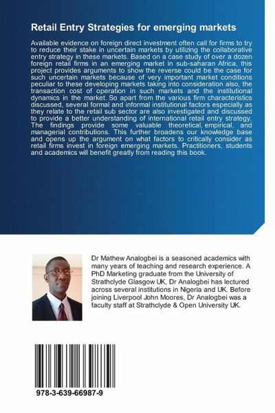 Available evidence on foreign direct investment often call for firms to try to reduce their stake in uncertain markets by utilizing the collaborative entry strategy in these markets. Based on a case study of over a dozen foreign retail firms in an emerging market in sub-saharan Africa, this project provides arguments to show the reverse could be the case for such uncertain markets because of very important market conditions peculiar to these developing markets taking into consideration also, the transaction cost of operation in such markets and the institutional dynamics in the market. So apart from the various firm characteristics discussed, several formal and informal institutional factors especially as they relate to the retail sub sector are also investigated and discussed to provide a better understanding of international retail entry strategy. The findings provide some valuable theoretical, empirical, and managerial contributions. This further broadens our knowledge base and opens up the argument on what factors to critically consider as retail firms invest in foreign emerging markets. Practitioners, students and academics will benefit greatly from reading this book.