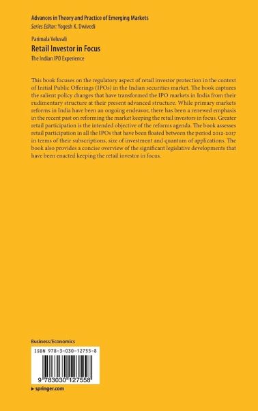 This book focuses on the regulatory aspect of retail investor protection in the context of Initial Public Offerings (IPOs) in the Indian securities market. The book captures the salient policy changes that have transformed the IPO markets in India from their rudimentary structure at their present advanced structure. While primary markets reforms in India have been an ongoing endeavor, there has been a renewed emphasis in the recent past on reforming the market keeping the retail investors in focus. Greater retail participation is the intended objective of the reforms agenda. The book assesses retail participation in all the IPOs that have been floated between the period 2012-2017 in terms of their subscriptions, size of investment and quantum of applications. The book also provides a concise overview of the significant legislative developments that have been enacted keeping the retail investor in focus.