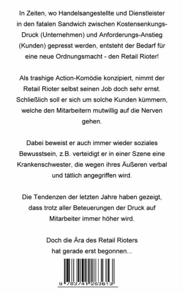 In Zeiten, wo Handelsangestellte und Dienstleister in das fatale Sandwich zwischen Kostensenkungs-Druck (Unternehmen) und Anforderungs-Anstieg (Kunden) gepresst werden, entsteht der Bedarf für eine neue Ordnungsmacht - den Retail Rioter!Als trashige Action-Komödie konzipiert, nimmt der Retail Rioter selbst seinen Job doch sehr ernst. Schließlich soll er sich um solche Kunden kümmern, welche den Mitarbeitern i.d.R. mutwillig auf die Nerven gehen.Dabei beweist er auch immer wieder soziales Bewusstsein, z.B. verteidigt er in einer Szene eine Krankenschwester, die wegen ihres Äußeren tätlich angegriffen wird.Die Tendenzen der letzten Jahre haben gezeigt, dass trotz aller Beteuerungen der Druck auf Mitarbeiter immer höher wird.Doch die Ära des Retail Rioters hat gerade erst begonnen ...