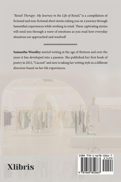 "Retail Therapy- My Journey in the Life of Retail," is a compilation of fictional and non-fictional short stories taking you on a journey through Samantha's experiences while working in retail. These captivating stories will send you through a wave of emotions as you read how everyday situations are approached and resolved!