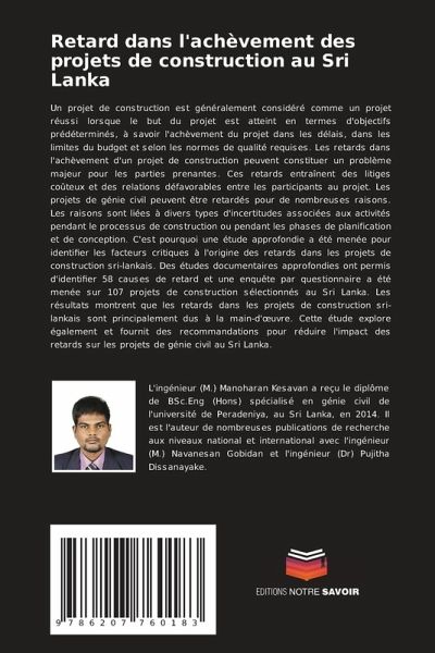 Un projet de construction est généralement considéré comme un projet réussi lorsque le but du projet est atteint en termes d'objectifs prédéterminés, à savoir l'achèvement du projet dans les délais, dans les limites du budget et selon les normes de qualité requises. Les retards dans l'achèvement d'un projet de construction peuvent constituer un problème majeur pour les parties prenantes. Ces retards entraînent des litiges coûteux et des relations défavorables entre les participants au projet. Les projets de génie civil peuvent être retardés pour de nombreuses raisons. Les raisons sont liées à divers types d'incertitudes associées aux activités pendant le processus de construction ou pendant les phases de planification et de conception. C'est pourquoi une étude approfondie a été menée pour identifier les facteurs critiques à l'origine des retards dans les projets de construction sri-lankais. Des études documentaires approfondies ont permis d'identifier 58 causes de retard et une enquête par questionnaire a été menée sur 107 projets de construction sélectionnés au Sri Lanka. Les résultats montrent que les retards dans les projets de construction sri-lankais sont principalement dus à la main-d'oeuvre. Cette étude explore également et fournit des recommandations pour réduire l'impact des retards sur les projets de génie civil au Sri Lanka.