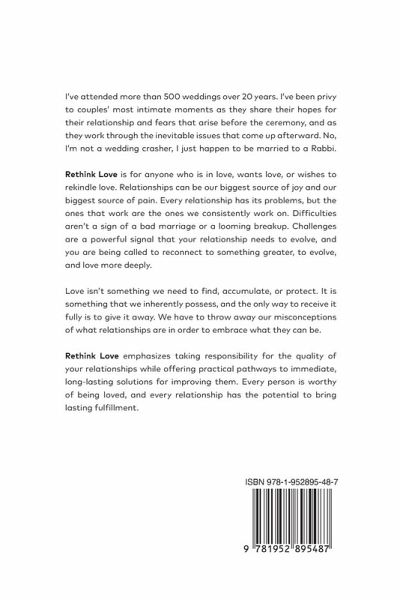 I've attended more than 500 weddings over 22 years. I've been privy to couples' most intimate moments as they share their hopes for their relationship and fears that arise before the ceremony, and as they work through the inevitable issues that come up afterward. No, I'm not a wedding crasher, I just happen to be married to a Rabbi. Rethink Love is for anyone who is in love, wants love, or wishes to rekindle love. Relationships can be our biggest source of joy and our biggest source of pain. Every relationship has its problems, but the ones that work are the ones we consistently work on. Difficulties aren't a sign of a bad marriage or a looming breakup. Challenges are a powerful signal that your relationship needs to evolve, and you are being called to reconnect to something greater, to evolve, and love more deeply. Love isn't something we need to find, accumulate, or protect. It is something that we inherently possess, and the only way to receive it fully is to give it away. We have to throw away our misconceptions of what relationships are in order to embrace what they can be. Rethink Love emphasizes taking responsibility for the quality of your relationships while offering practical pathways to immediate, long-lasting solutions for improving them. Every person is worthy of being loved, and every relationship has the potential to bring lasting fulfillment.