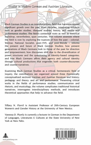Black German Studies is an interdisciplinary field that has experienced significant growth over the past three decades, integrating subjects such as gender studies, diaspora studies, history, and media and performance studies. The field's contextual roots as well as historical backdrop, nevertheless, span centuries. This volume assesses where the field is now by exploring the nuances of how the past - colonial, Weimar, National Socialist, post-1945, and post-Wende - informs the present and future of Black German Studies; how present generations of Black Germans look to those of the past for direction and empowerment; how discourses shift due to the diversification of power structures and the questioning of identity-based categories; and how Black Germans affirm their agency and cultural identity through cultural productions that engender both counter-discourses and counter-narratives.