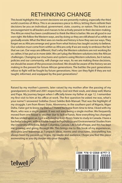 Raised by my mother's parents, later raised by my mother after the passing of my grandparents in 2000 and 2001 respectively. God rest their souls, and sleep well, Mama and Papa. My journey began when I officially knew my father at age 12. I remember my first visit to him at his office at work. The first question he asked me was, what's your name? I answered Soibifaa (Soso) Sekibo Bob-Manuel. That was the highlight of my struggle. I am from Rivers State, Abonnema, in the southern part of Nigeria, Niger Delta. I later got to know my Dad as I visited his home from time to time. I lived with my Mum, who was a single parent. It was not easy being a single mother. We frequently moved from one house to another due to lack of funds. Now everything has changed; life has smiled upon us. I got a scholarship from Rivers State to study in Canada. I have a bachelor's degree, with a double major in Psychology and Environmental Studies from the University of Victoria, British Columbia, Canada. Life is full of hope, and this has kept me growing and going through life. This brings me to this book of my experiences, thoughts and learnings as I unpack ideas, norms and structures. Storytelling has always be my passion, so to you, my reader and audience, I hope you find this piece exonerating as you dig deeper into your thoughts.