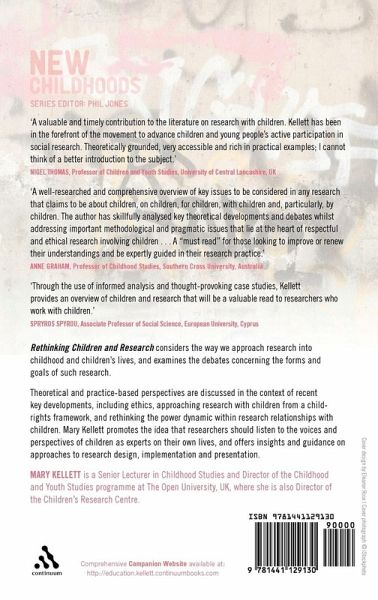 Rethinking Children and Research considers the way people approach research into childhood and children's lives and examines the debates concerning the forms and goals of such research. Theoretical and practice-based perspectives are discussed in the context of recent key developments in research theory and philosophy of children. Mary Kellett promotes the idea that researchers should listen to the voices and perspectives of children as experts on their own lives, and offers insights and guidance on approaches to research design, implementation and presentation. Recent debates and developments are considered, including ethics, approaching research with children from a child-rights framework, and rethinking the power dynamic within research relationships with children. Rethinking Children and Research is essential for studying childhood and undergraduate or postgraduate level, and will be of interest to all involved with research into childhood and children's lives in the areas of education, health and social services.
