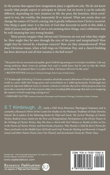 In the poems that appear here imagination plays a significant role. We do not know exactly what people expect or anticipate at Advent, but we know it can be radically different, depending on one's situation in life: the poor, the homeless, those enveloped in war, the wealthy, the desperately ill or injured. What one awaits does not change the nature of Christ's coming, but it greatly influences how Christ is received. One thing is quite clear: it is the love of God that descends to earth in this child, a child of peace and goodwill. If one is not awaiting these things, one's celebration may be well-meaning but very wrong-headed. These poems imagine what Advent and Christmas are not and what they might be. How might they be seen through the eyes of the poor and marginalized? How might they be viewed by a business concern? How are they misunderstood? What does Christmas mean, when a bell rings on Christmas Day, and a church building has been destroyed and all that remains is the bell tower?
