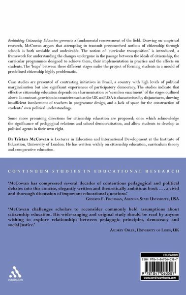 Rethinking Citizenship Education presents a fundamental reassessment of the field. Drawing on empirical research, the book argues that attempting to transmit preconceived notions of citizenship through schools is both unviable and undesirable. The notion of 'curricular transposition' is introduced, a framework for understanding the changes undergone in the passage between the ideals of citizenship, the curricular programmes designed to achieve them, their implementation in practice and the effects on students. The 'leaps' between these different stages make the project of forming students in a mould of predefined citizenship highly problematic. Case studies are presented of contrasting initiatives in Brazil, a country with high levels of political marginalisation, but also significant experiences of participatory democracy. These studies indicate that effective citizenship education depends on a harmonisation or 'seamless enactment' of the stages outlined above. In contrast, provision in countries such as the UK and USA is characterised by disjunctures, showing insufficient involvement of teachers in programme design, and a lack of space for the construction of students' own political understandings. Some more promising directions for citizenship education are proposed, therefore, ones which acknowledge the significance of pedagogical relations and school democratisation, and allow students to develop as political agents in their own right.