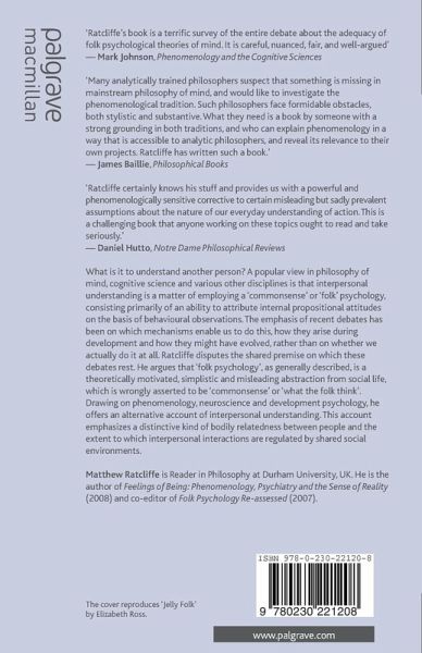 'Ratcliffe covers every detail of a thorough repudiation of standard accounts of how we understand other people. Folk psychology is dead and we can forget it since, as Ratcliffe shows, we clearly do not need it for purposes of understanding others or even explaining how we understand others. Ratcliffe has eliminated FP, not in the way that some hard-line reductionists would want it eliminated, but by showing its irrelevancy. The hard-line reductionists no longer need to worry about FP; at the same time, Ratcliffe provides them with much more serious things to worry about, since reductionism is dead too.' - Shaun Gallagher, Chair and Professor of Philosophy, University of Central Florida, editor of Phenomenology and the Cognitive Sciences