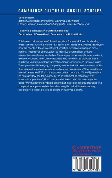 This book provides a powerful theoretical framework for understanding cross-national cultural differences. Focusing on France and America, it analyses how the people of these two different cultures mobilise national 'repertoires of evaluation' to make judgements about politics, economics, morals and aesthetics. The analysis draws on eight case studies by eleven French and American researchers who have worked together over a number of years to develop systematic comparisons between these countries. The topics are wide-ranging, comparing how individuals use the cultural tools at their disposal to answer questions such as: are races equal? What constitutes sexual harassment? What is the value of contemporary art? Should journalists be neutral? How can the defense of the environment be reconciled with economic imperatives? Moving beyond simplistic essentialist models of national character, this comparative approach offers important insights that will interest not only sociologists but also political scientists and anthropologists.