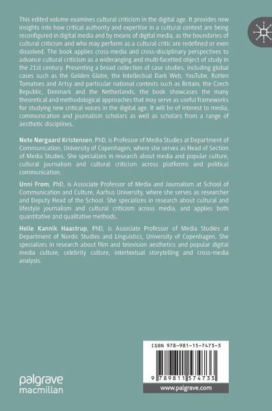 This edited volume examines cultural criticism in the digital age. It provides new insights into how critical authority and expertise in a cultural context are being reconfigured in digital media and by means of digital media, as the boundaries of cultural criticism and who may perform as a cultural critic are redefined or even dissolved. The book applies cross-media and cross-disciplinary perspectives to advance cultural criticism as a wide-ranging and multi-facetted object of study in the 21st century. Presenting a broad collection of case studies, including global cases such as the Golden Globe, the Intellectual Dark Web, YouTube, Rotten Tomatoes and Artsy and particular national contexts such as Britain, the Czech Republic, Denmark and the Netherlands, the book showcases the many theoretical and methodological approaches that may serve as useful frameworks for studying new critical voices in the digital age. It will be of interest to media, communication and journalism scholars as well as scholars from a range of aesthetic disciplines.