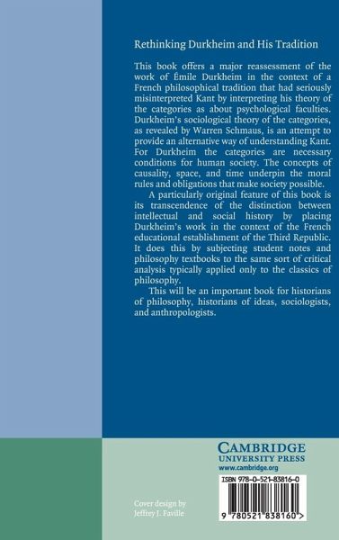 This book offers a reassessment of the work of Emile Durkheim in the context of a French philosophical tradition that had seriously misinterpreted Kant by interpreting his theory of the categories as psychological faculties. Durkheim's sociological theory of the categories, as revealed by Warren Schmaus, is an attempt to provide an alternative way of understanding Kant. For Durkheim the categories are necessary conditions for human society. The concepts of causality, space and time underpin the moral rules and obligations that make society possible. A particularly interesting feature of this book is its transcendence of the distinction between intellectual and social history by placing Durkheim's work in the context of the French educational establishment of the Third Republic. It does this by subjecting student notes and philosophy textbooks to the same sort of critical analysis typically applied only to the classics of philosophy.