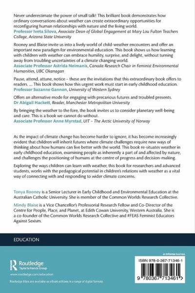 Pause, attend, attune, notice - these are the invitations that this extraordinary book offers to readers. Meticulous tracings are presented of weather learning through modalities of doing, walking, writing, making and becoming. Environmental education opens to complexity, vulnerability, and responsibility as we humans come to understand that we are inherently entangled in volatile ecologies and constantly shifting relations with and in the world. This book shows how this urgent work must start in early childhood education. Children's intimate encounters with weather extend from everyday moments in open spaces and playgrounds to deep time, Indigenous time, colonial time and the ever-present press in these times of human-induced climate change. The authors introduce practices for how we might envisage and work towards new weather worlds and make a significant and fresh contribution to posthuman educational research.